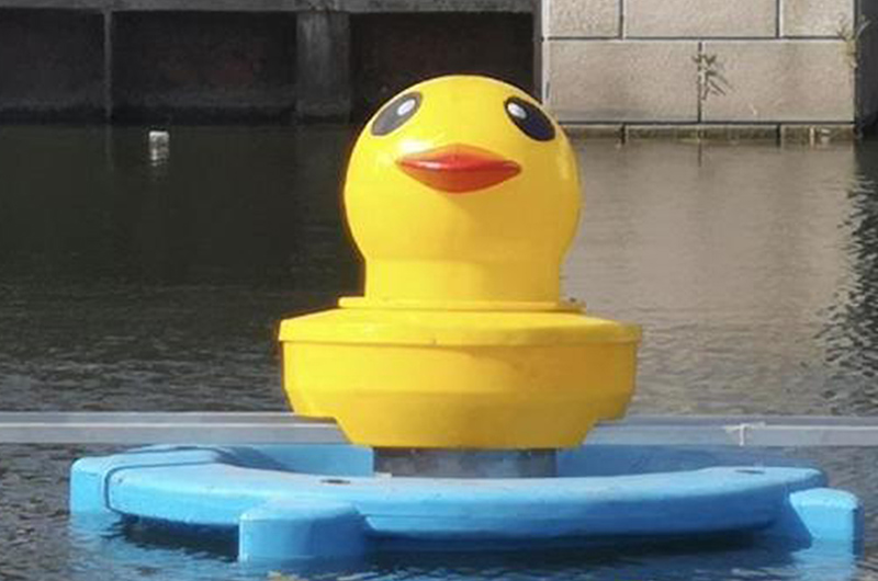 日湖水面上“蹿出”一只萌萌的“小黄鸭”,不停快速运转着。“其实这是一台水车式增氧涌浪机,也是我区第一台卡通造型的涌浪机。”江北区治水办工作人员说。